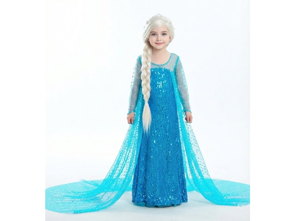 Dovolte vaší malé princezně zazářit v šatech, které jsou ztělesněním magické elegance. Tyto úchvatné šaty inspirované Elzou nejsou jen kostýmem, ale uměleckým kouskem. Celý povrch šatů pokrývají tisíce třpytivých flitrů, které při každém pohybu odrážejí světlo a vytvářejí luxusní, přímo mrazivě krásný efekt.